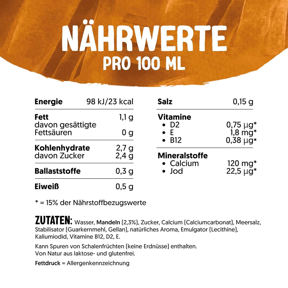 Alpro Mandeldrink Ohne Zucker er en plantebaseret mandeldrik til dem, der ønsker en mulighed uden sukker, mælkeprodukter eller gluten, og samtidig bevare en rig og cremet smag. Beriget med calcium og essentielle vitaminer er den velegnet til hele familien, i den daglige kost eller som et alternativ til mælk i kaffe, korn eller te.
