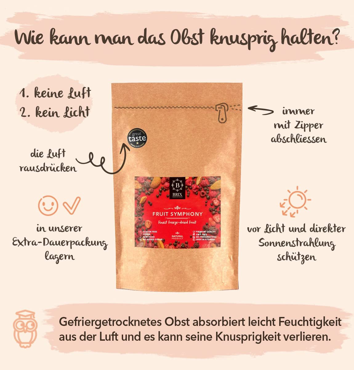 • Lækker frysetørret frugt - Hvorvidt frysetørret frugt smager godt eller ej afhænger af kvaliteten af ​​den friske frugt, der bruges. Vi tilbyder kun frugt, der er traditionelt dyrket af små landmænd, høstet, når det er modent og forarbejdet inden for to timer efter høst. Derfor er 19 af vores produkter blevet hædret med en "Great Taste Award". PRAKTISK SUCCESFULD BAG - Frysetørrede frugter har en lang holdbarhed, når de opbevares i deres forseglede emballage, hvilket holder dem tørre og friske.