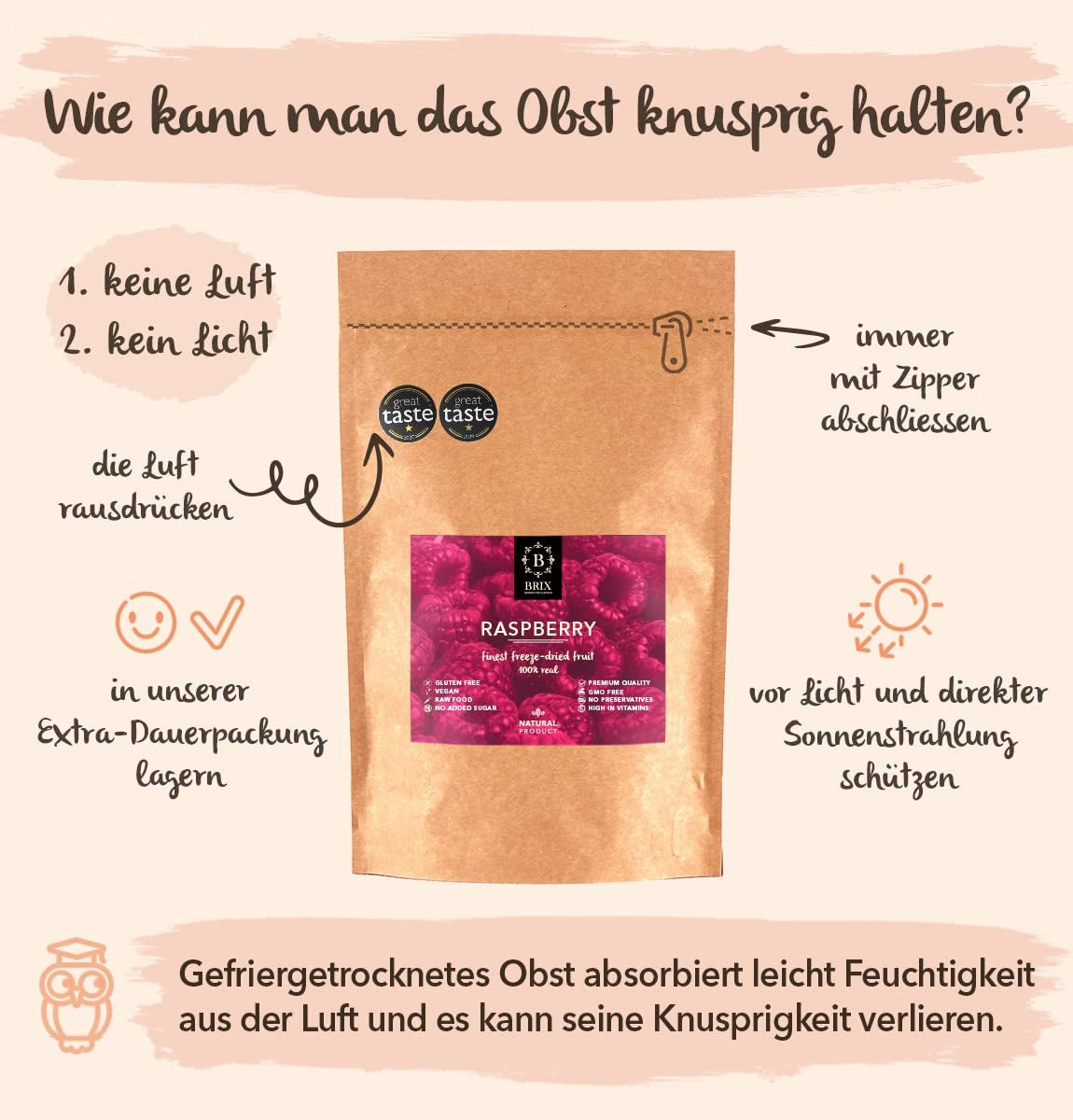 - GOD KILDE TIL VITAMINER OG MINERALER - Vores frysetørrede frugter er en fremragende kilde til vitaminer og indeholder C-vitamin, antioxidanter, mineraler og fibre. 8 g af vores frysetørrede frugter er 1 af de 5 anbefalede portioner frugt og grønt om dagen. Lækker frysetørret frugt - Hvorvidt frysetørret frugt smager godt eller ej afhænger af kvaliteten af den friske frugt, der bruges. Vi tilbyder kun frugt, der er traditionelt dyrket af små landmænd, høstet, når det er modent og forarbejdet inden for to timer efter høst. Derfor er 19 af vores produkter blevet hædret med en "Great Taste Award". PRAKTISK SUCCESFULD BAG - Frysetørrede frugter har en lang holdbarhed, når de opbevares i deres forseglede emballage, hvilket holder dem tørre og friske.