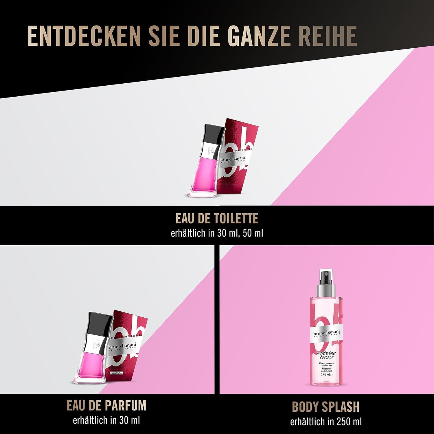 Bruno Banani Dangerous Woman Eau de Parfum. Da hun kommer ind i rummet, er alle øjne rettet mod hende: Den farlige kvinde. Vis din sexede og farlige side med denne bruno banani-parfume - til alle kvinder, der ved, hvad de vil have. Topnoten af saftige ribs tilbyder en let frugtagtig aroma og er forførende afrundet af midternoten af delikate blomster og sensuel kokosmælk. Dameparfumen gøres endnu mere attraktiv af den specielle basisnote af heliotrop, lækre cremede gourmandnoter og vanilje absolut. Det typiske asymmetriske design af flasken og det slående lyserøde og sorte farveskema fremkalder den mystiske side af en kvinde. Topnote: ribs, mellemnote: sarte blomster, kokosmælk. Bundnote: heliotrop, gourmandnoter, absolut vanilje. bruno banani - Det er ikke for alle! Nonkonform, individuel og moderigtig: Den Chemnitz-baserede undertøjs- og vareproducent Bruno Banani har været en integreret del af den tyske modeindustri siden starten i 1994. I over 20 år har virksomheden været synonym med kvalitet og eksklusivitet. Udover højkvalitets undertøj er kultmærket også kendt for uimodståeligt interessante dufte og unikke accessories - skabt til individualister!