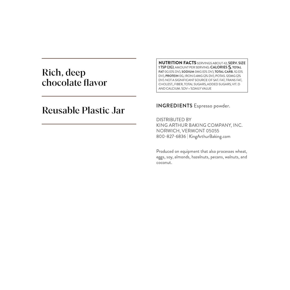 Tilføj ny dybde til din chokoladesmag med King Arthur Baking Company's Espresso Powder, et fint malet kaffepulver pakket i en 3 oz (85 g) beholder. Perfekt til ivrige kokke og dem, der ønsker tilføjet smagskompleksitet i chokoladekager og desserter.