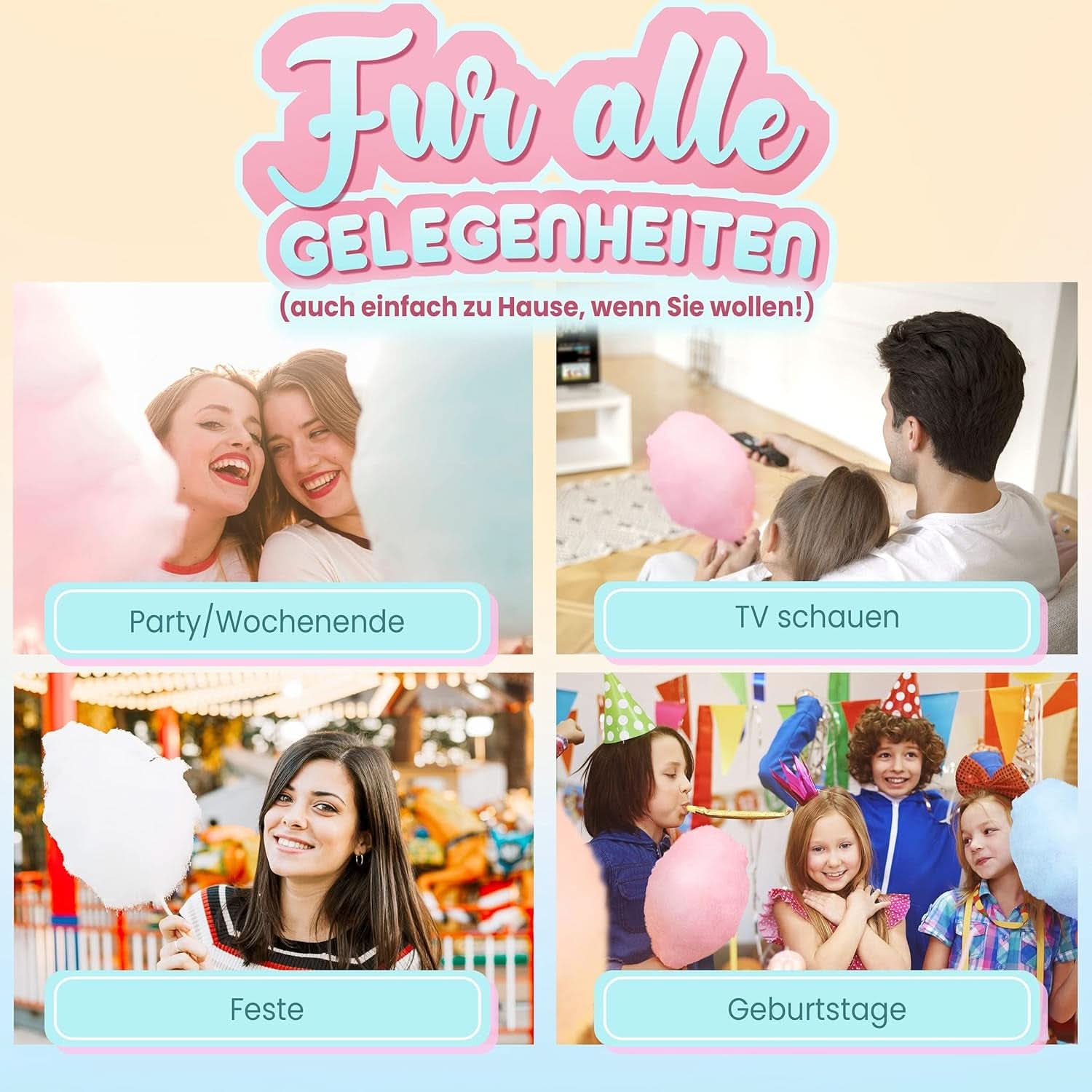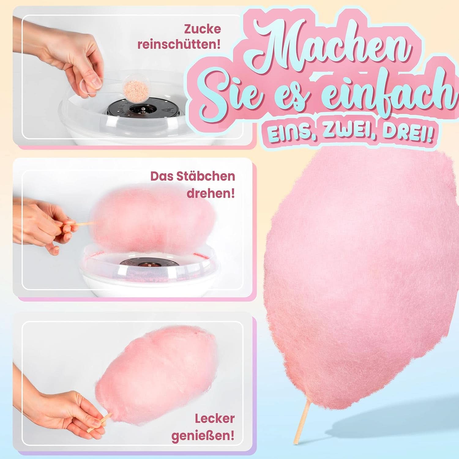 Med candy floss sættet kan du nemt fremkalde candy floss stemning derhjemme. Ideel til fødselsdage, bryllupper eller temafester: Kom i gang og skab din egen candy floss med dine gæster. Dette aromatiseret candyfloss-maskinesæt vil blænde børn og bringe barndomsminder tilbage for voksne. Sælges af: Sohi LLC, 4 petite place st Pierre Latour, 43000 Le Puy en Velay, Frankrig