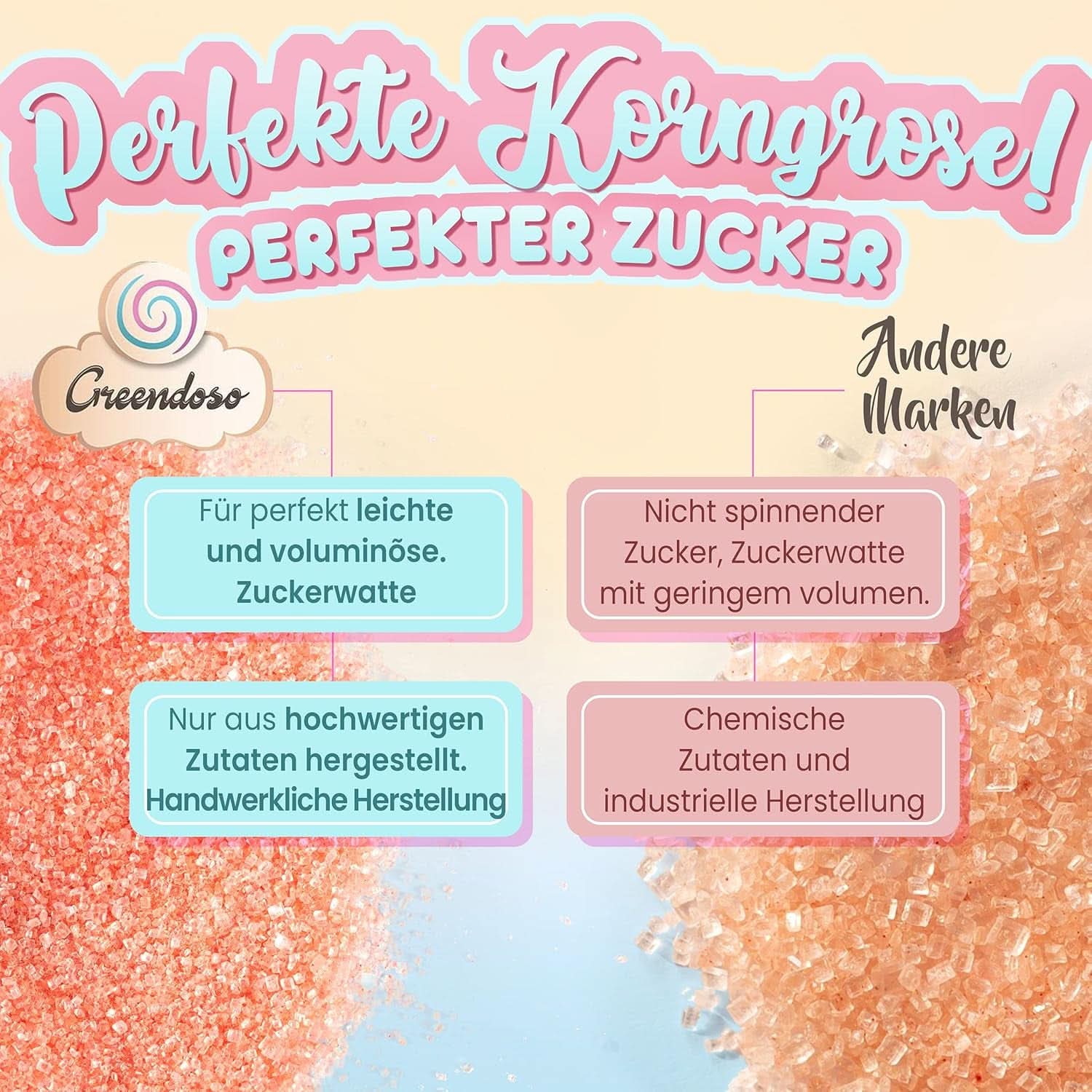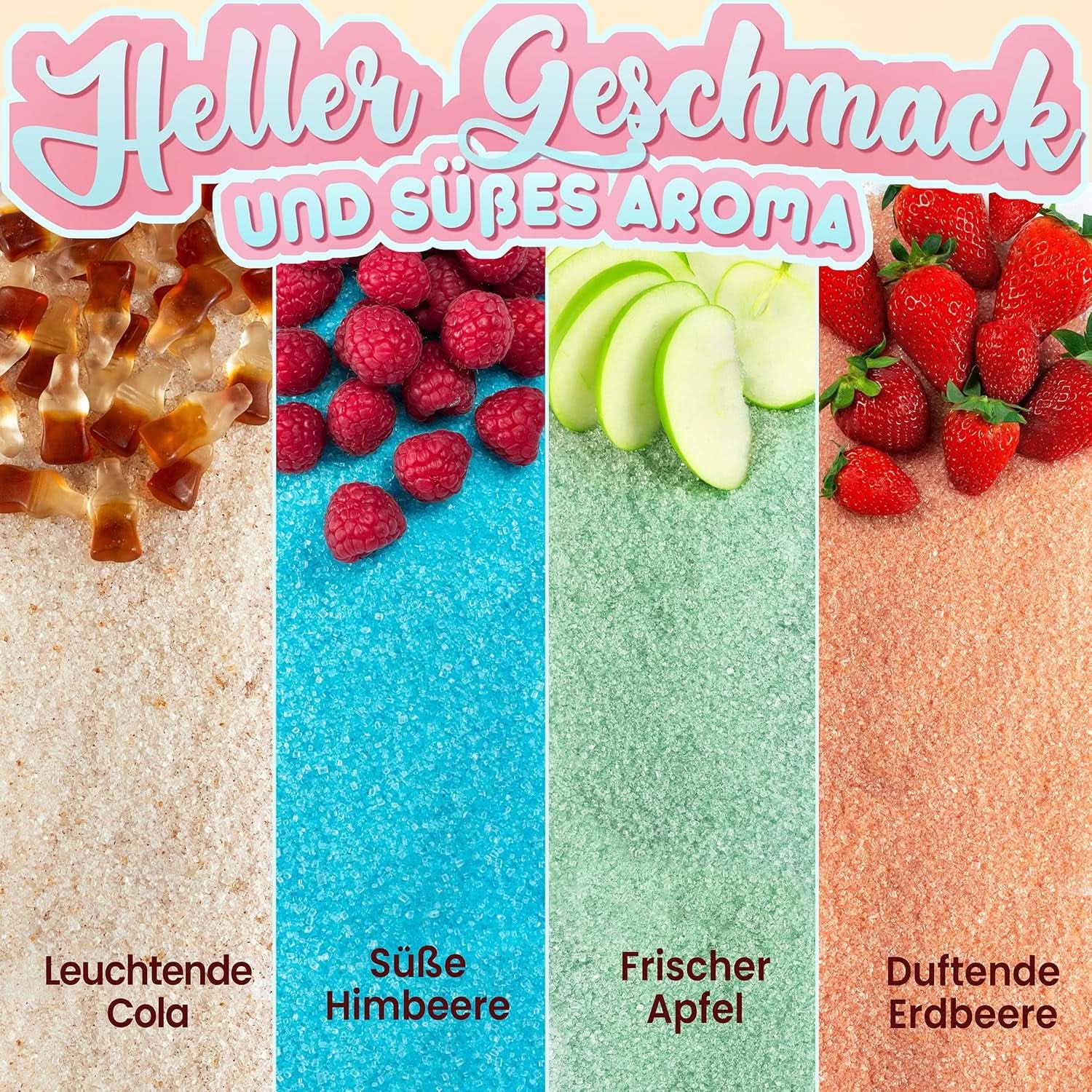 Vores candyfloss-smag er lavet af ingredienser af høj kvalitet. Størrelsen på sukkerknalderne sikrer, at sliktråden ideelt set er let og stor. Garanteret uden animalsk gelatine eller sødestoffer.