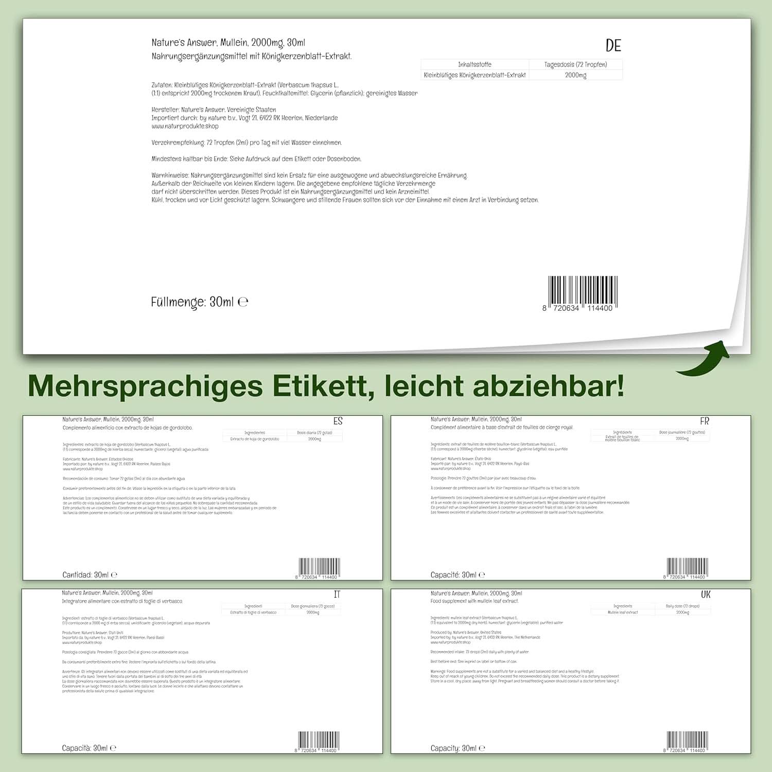 - KONCENTRERET DOSIS: En 72-dråber dosis af Nature's Answer mulleinekstrakt indeholder 2000 mg mulleinbladekstrakt, som du kan tage ind i din krop dagligt