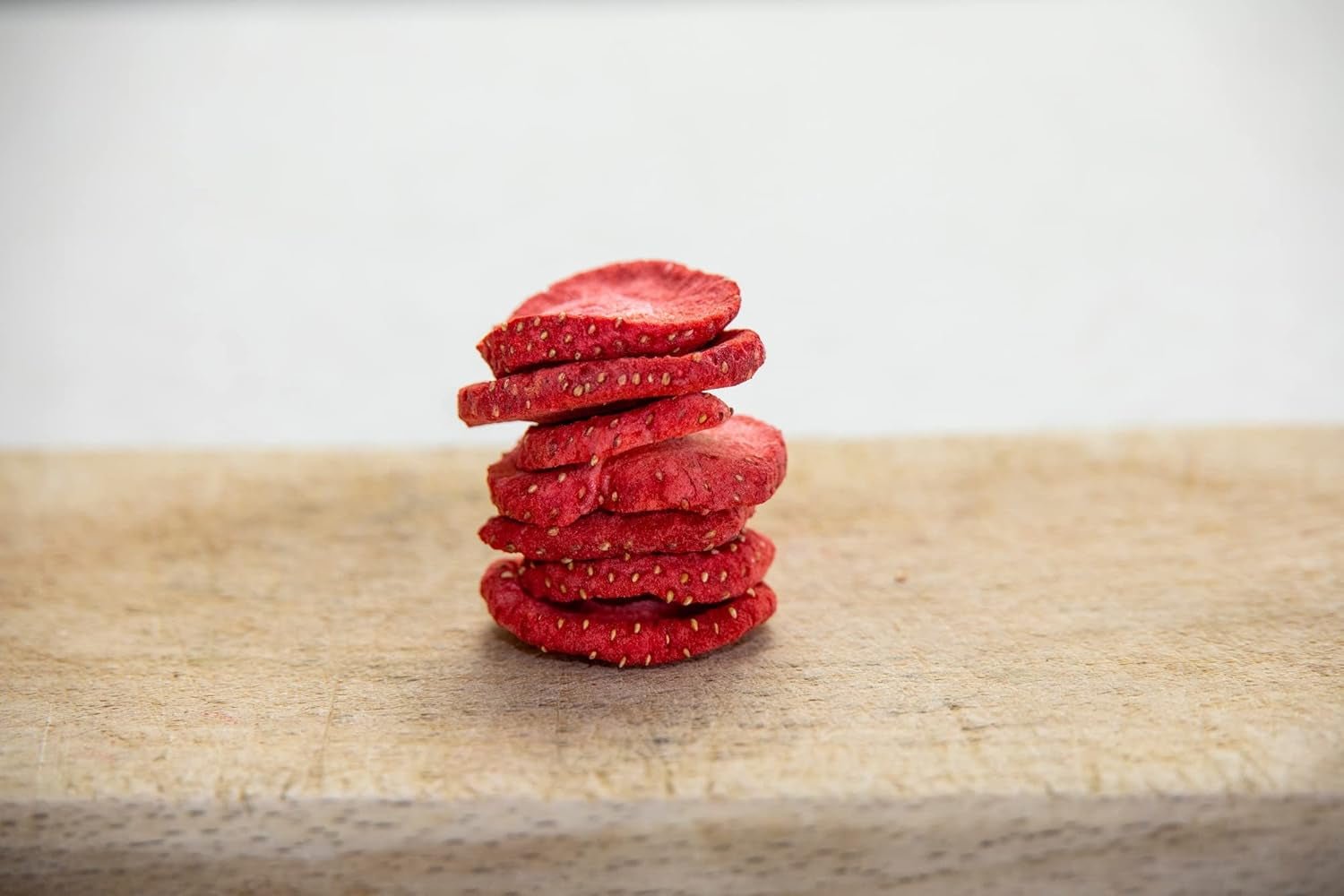 Væsken udvindes fra de frysetørrede jordbær, så de komprimerede bær får en sprød konsistens og er let sprøde, når de tygges. Et godt alternativ til kartoffelchips.