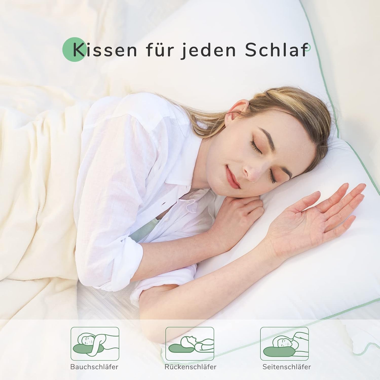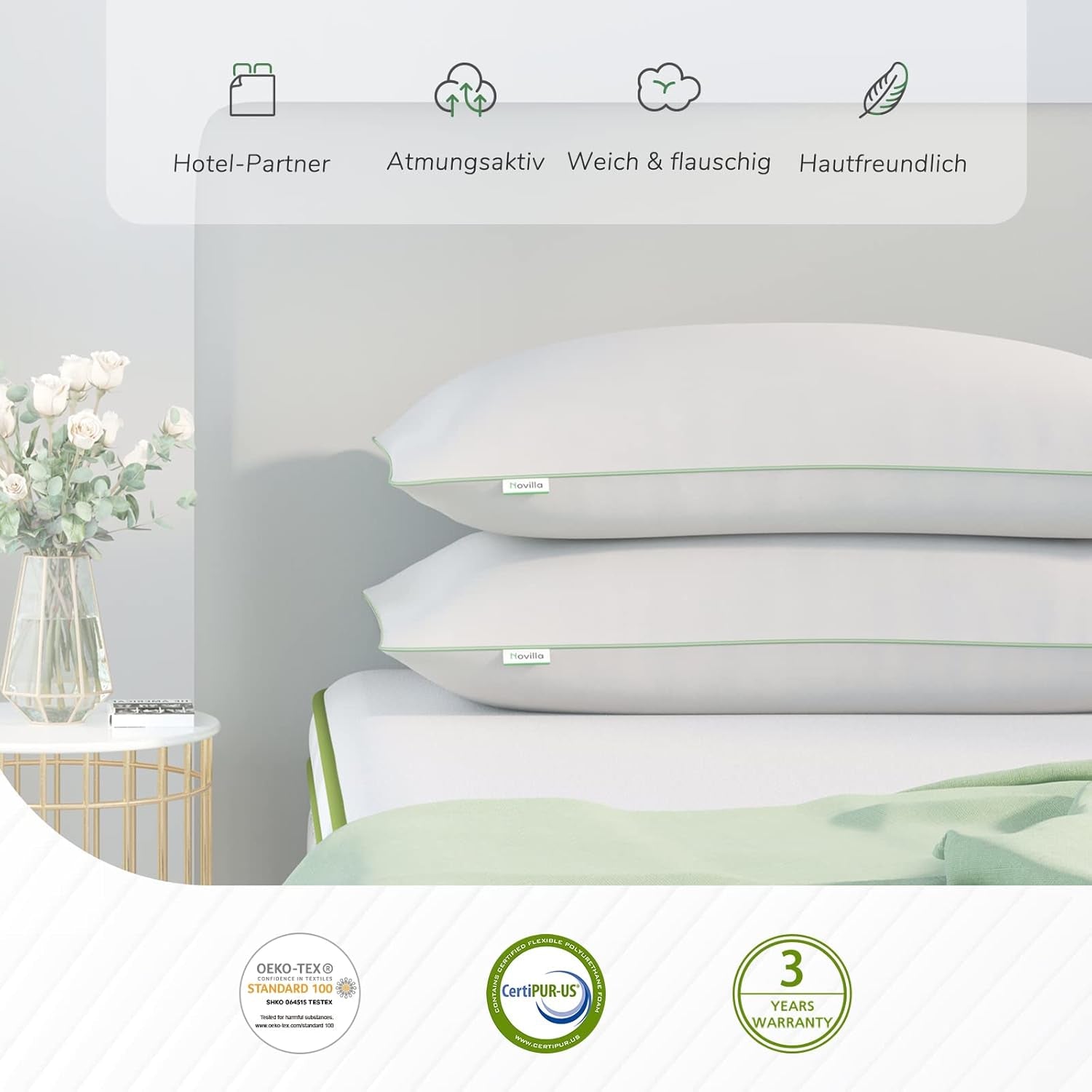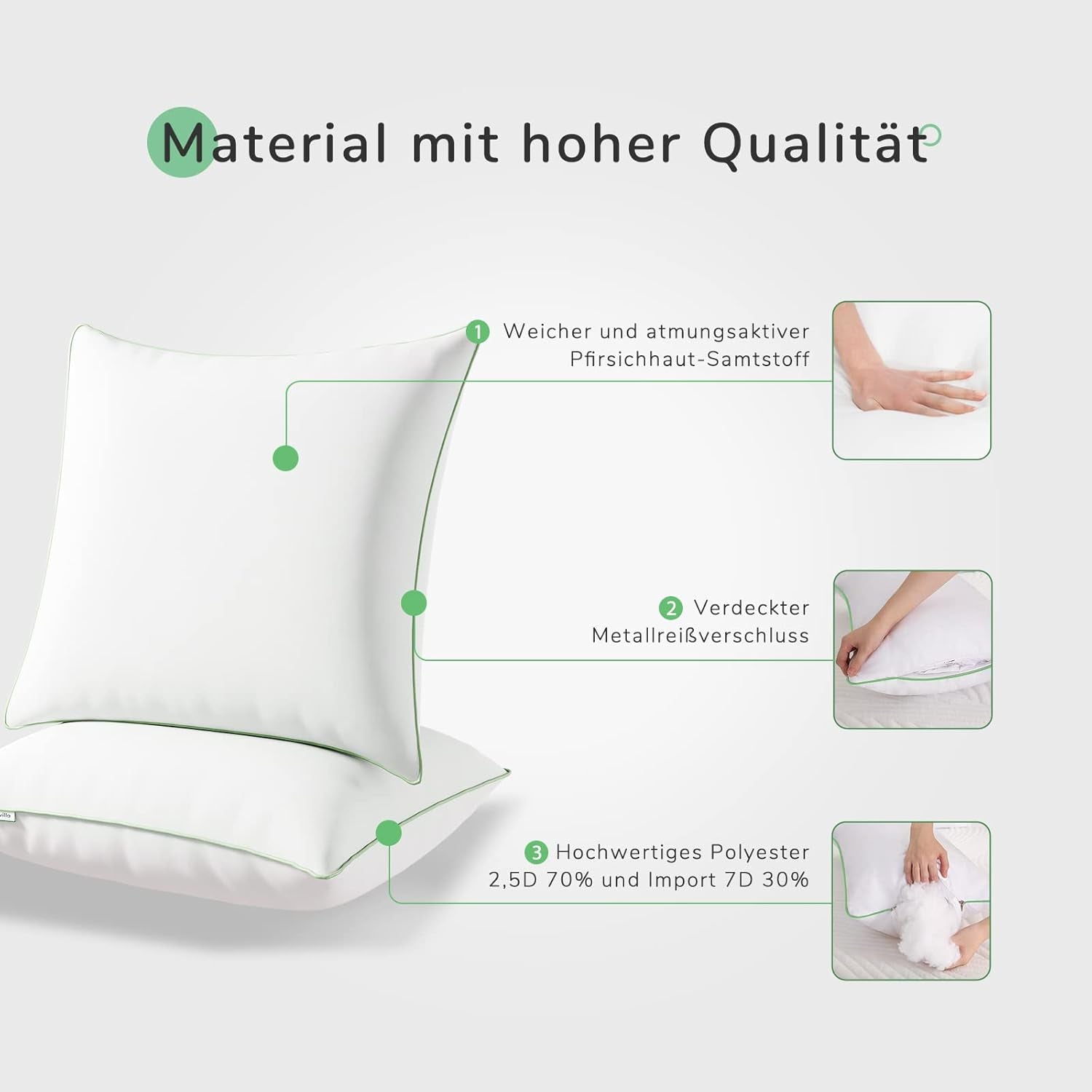 - "Certified Breathable Cover" Vores sovepuder er designet med en enkel og elegant grøn kant i grønne koncepters ånd. Pudebetrækket er lavet af OEKO-TEX certificeret ferskenfarvet fløjlsstof, som er åndbart og hudvenligt, hvilket giver dig en behagelig kølig søvn.