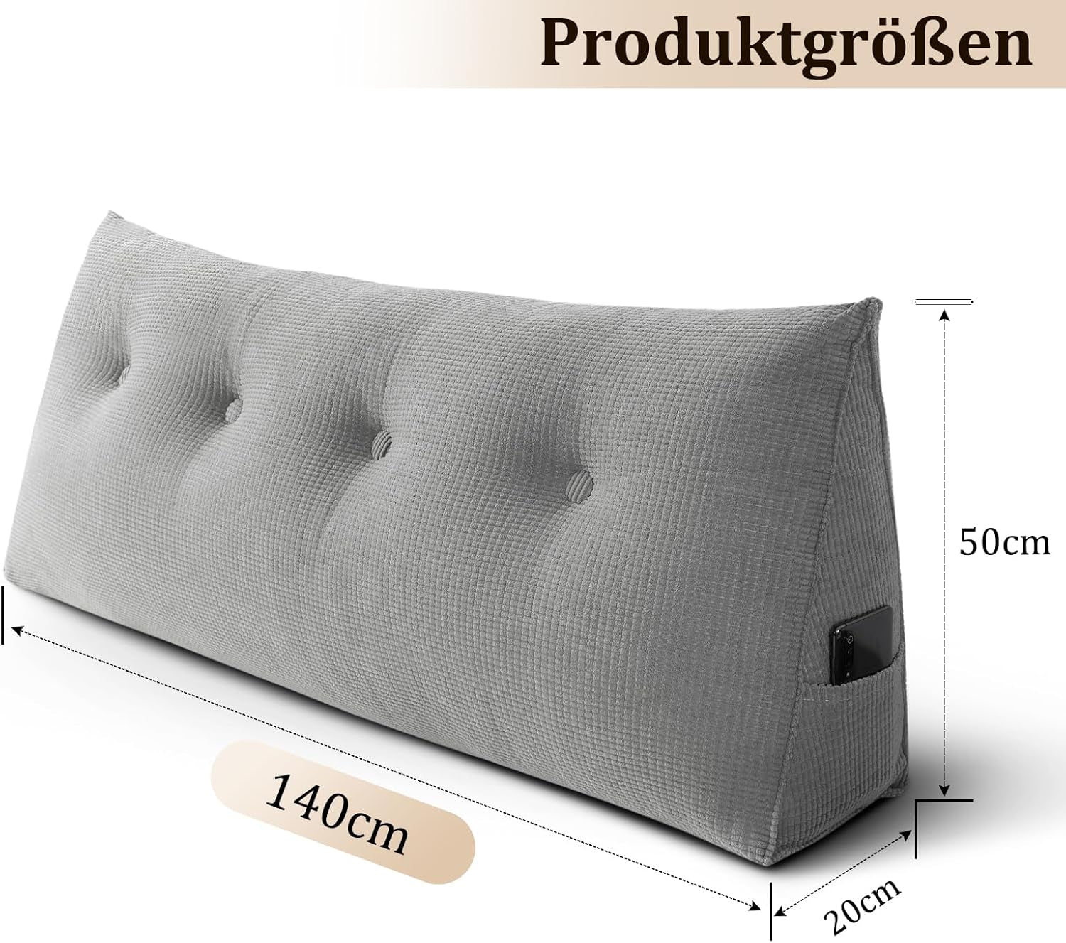 Rygpude, læsepude til seng og sofa, 140 cm - behagelig vægpude til sengen, giver optimal støtte til rygpuden til sengen, sengepude med praktiske sidelommer, grå,