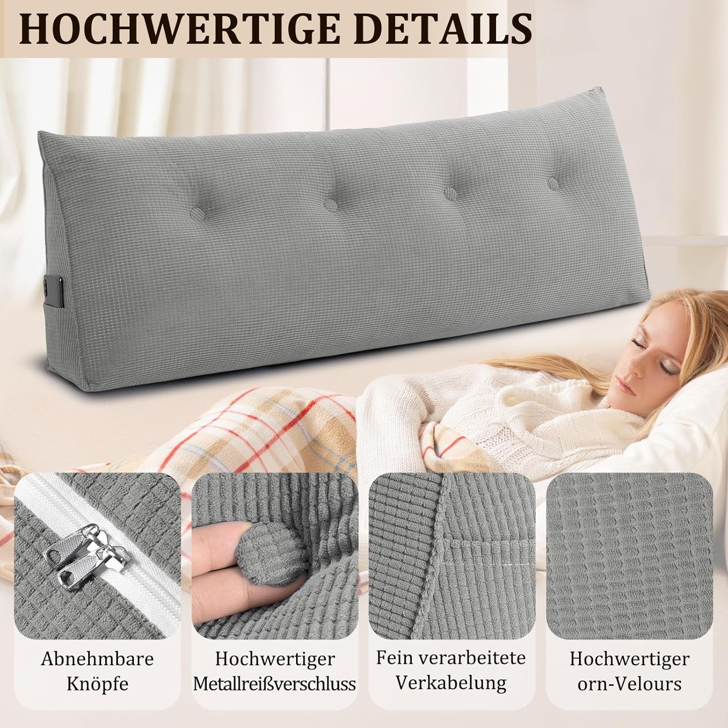 - Højkvalitets, holdbare materialer: Vores rygpuder er betrukket med hudvenlig majsfløjl og fyldt med udvalgt højkvalitets bomuld. Under produktionsprocessen bliver hver daybed udsat for adskillige tests for at sikre, at fyldets tæthed og det ydre udseende lever op til vores høje standarder. Dette sikrer, at enhver kunde kan nyde en brugeroplevelse af høj kvalitet Perfekt fyld, stabil støtte: Denne trekantede pude har et unikt fjerdesign og er fyldt med højkvalitets bomuld. Det specialbehandlede fyld bevarer sin form og elasticitet selv efter længere tids brug. Det giver kontinuerlig støtte, reducerer trykket på ryg og nakke og lindrer smerter forårsaget af dårlige holdningsvaner. Uanset om du læser, ser tv eller slapper af - med denne læsepude vil du altid nyde behagelige stunder