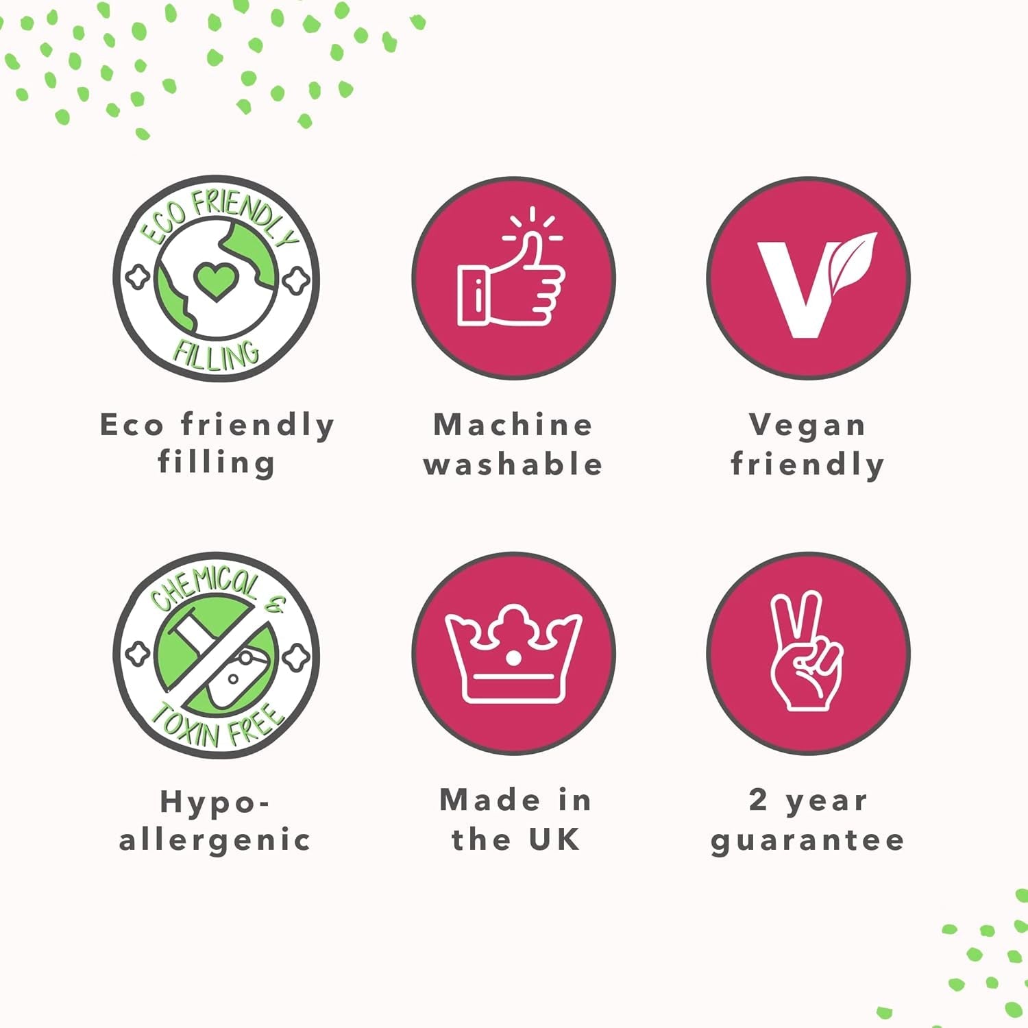 - Miljøvenlig komfort: Blissful Bedtimes puder er fyldt med 100 % genbrugsmateriale uden at gå på kompromis med komforten. Hvert par puder hjalp med at forhindre mindst 36 plastikflasker i at komme ind i havene eller lossepladser. Åndbart betræk til alle: Disse puder er pakket ind i blødt og åndbart mikrofiber og er medium faste, hvilket gør dem til en fantastisk allrounder til alle sovestillinger, uanset om de er på siden, bagpå eller foran. Brug én pude for blød til medium komfort eller dobbelt op og brug to puder, hvis du foretrækker ekstra støtte.Veganvenlig: Grusomhedsfri og indeholder ikke animalske derivater.Hypoallergen og maskinvaskbar: Fri for skadelige kemikalier og materialer, der kan forårsage irriterende allergier eller hudirritation. Kan maskinvaskes for langvarig friskhed.
