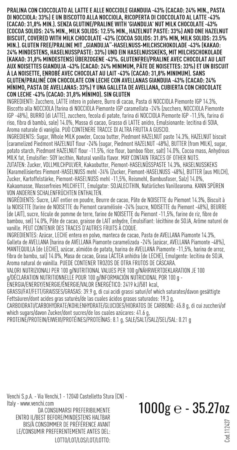 "GIANDUJA" MÆLKECHOKOLADEPRALINE -43% (KAKAO: MINIMUM 24%, HASSELNØDDPASTA: 33%) OG ET STUK HASSELNØD DÆKKET MED MÆLKECHOKOLADE (KAKAO: MINIMUM 31,8%) -43%. GLUTENFRI INGREDIENSER: sukker, SØDEMÆLKSPULVER, kakaosmør, PIEMONT HASSELNØDDPASTA 14,3%, HASSELNØDDER (karameliseret PIEMONT HASSELNØDDEmel -24% (sukker, PIEMONT HASSELNØDDER -48%), SMØR (fra sukker, 5% hasselnøddemel), 5% hasselnøddemel, 100% sukker. rismel, bambusfiber, salt) 14,0%, masse kakao, vandfrit MÆLKefedt, emulgator: SOJALECITIN, naturlig vaniljesmag. KAN INDEHOLDE SPOR AF ANDRE NØDDER.